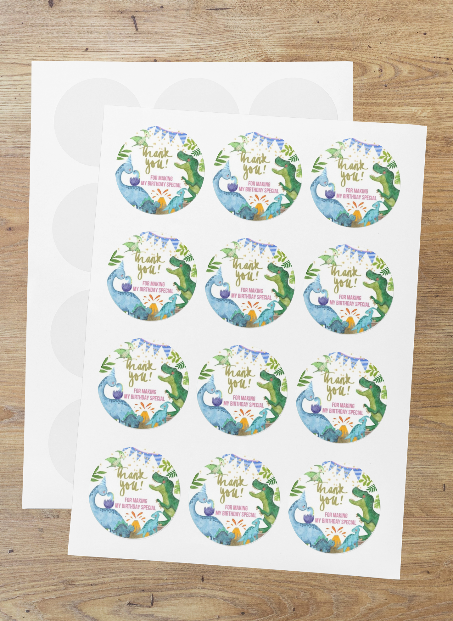 Theme Dinosaur Return gift stickers are small adhesive labels that are used to mark and personalize gift bags or boxes that are given as party favors or thank you gifts. The product content of return gift stickers typically includes: