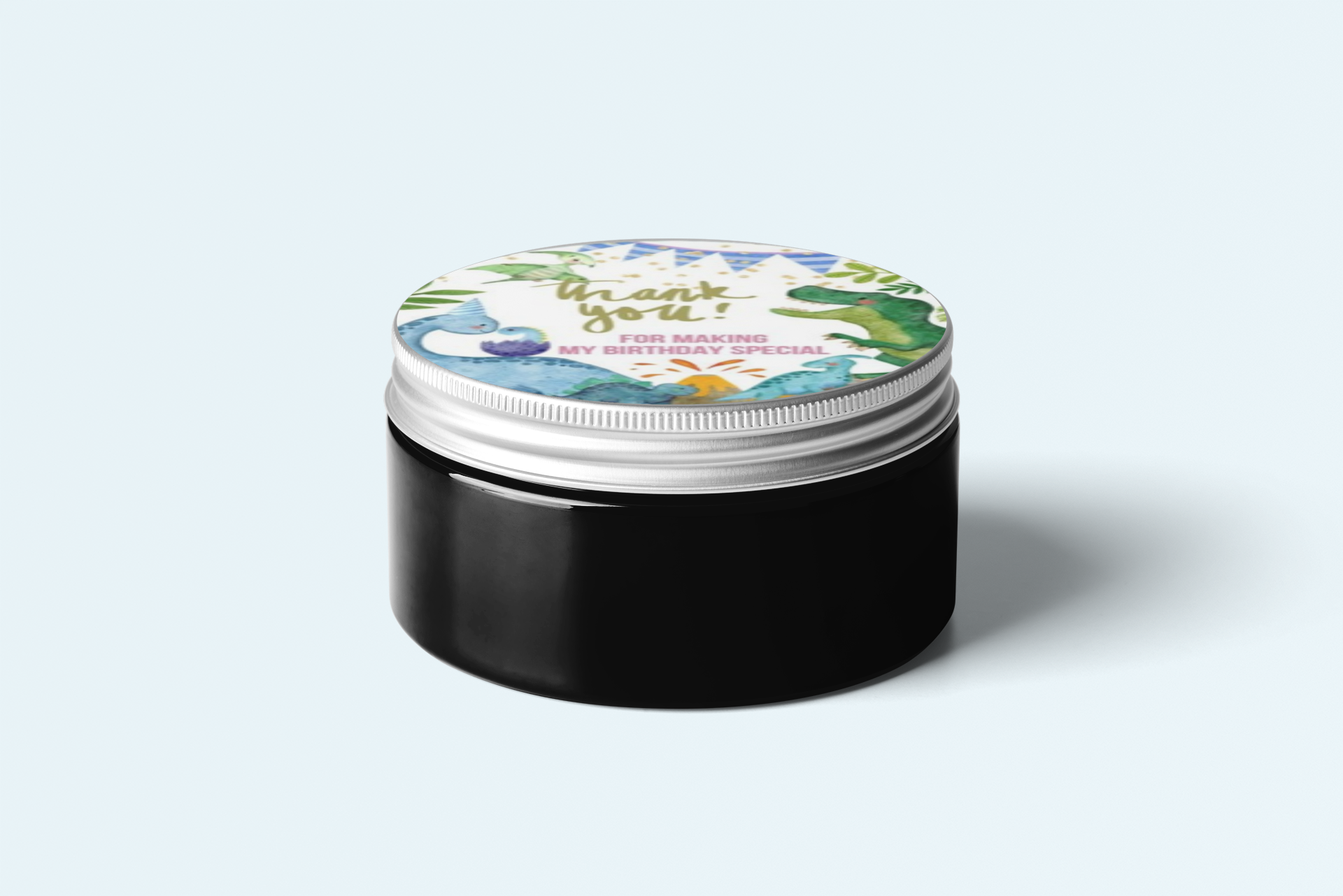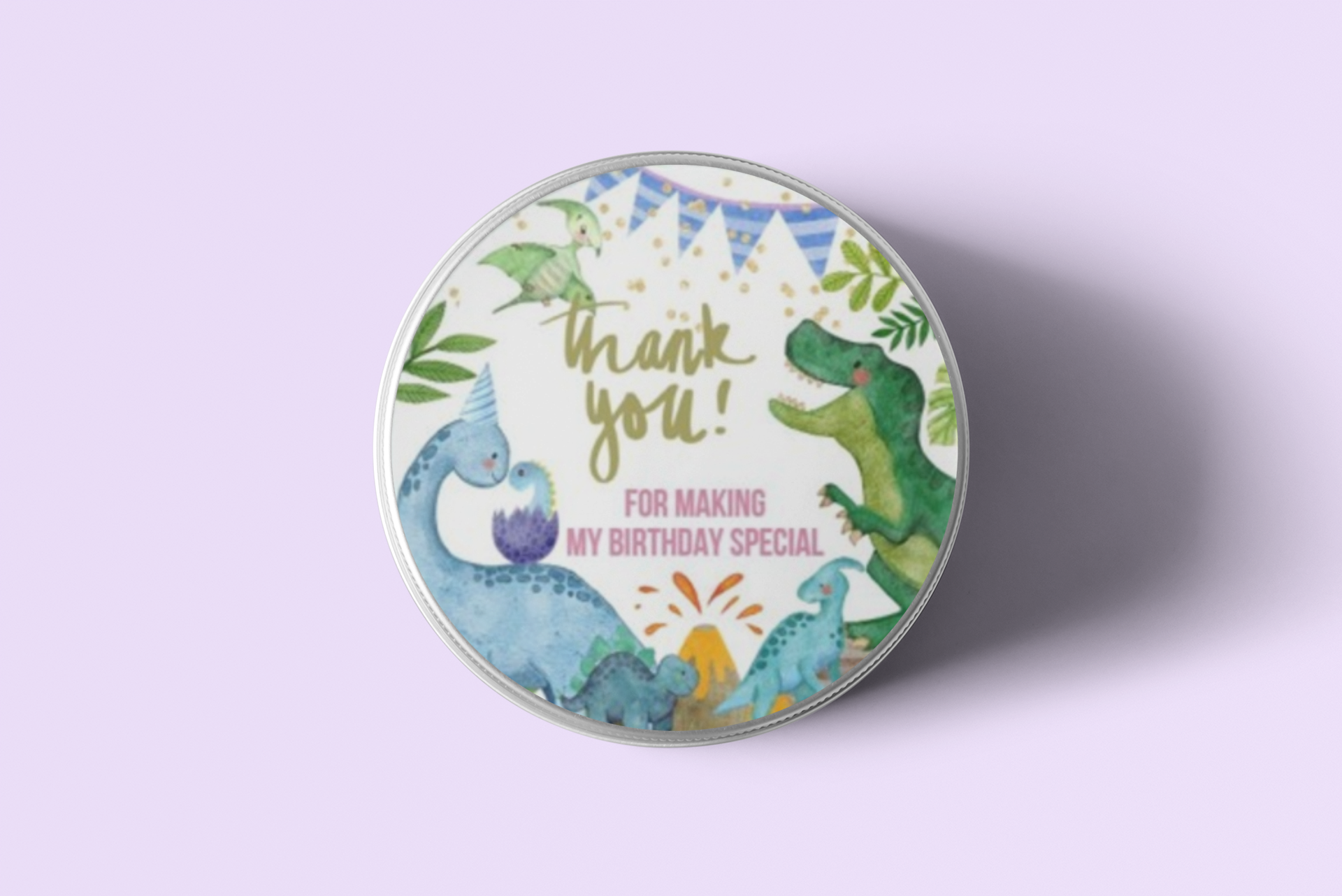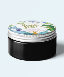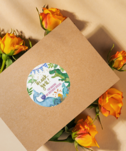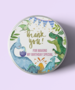 Design: Return gift stickers come in a circular shaped Dinosaur design. The designs comes with Dinosaur and simple text such as “Thank you” or “Happy Birthday” written on it.