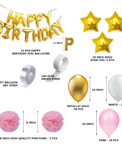 80 Pcs DIY Happy Birthday Kit – Pink Gold White Balloon with PomPom & Happy birthday Foil Banner