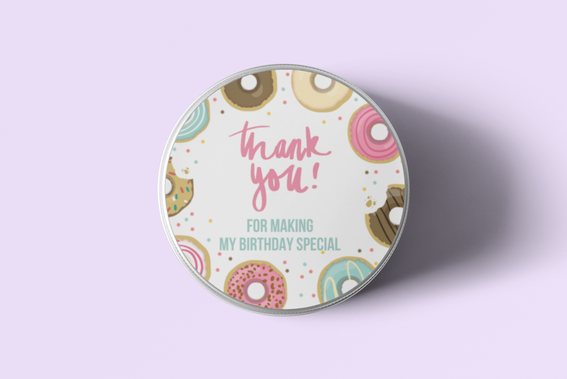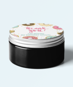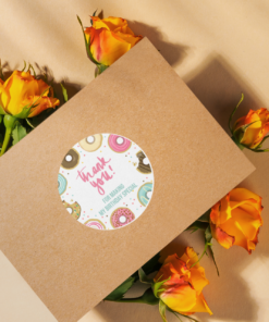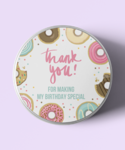 Design: Return gift stickers come in a circular shaped Doughnut design. The designs comes with Doughnut and simple text such as “Thank you” or “Happy Birthday” written on it.
