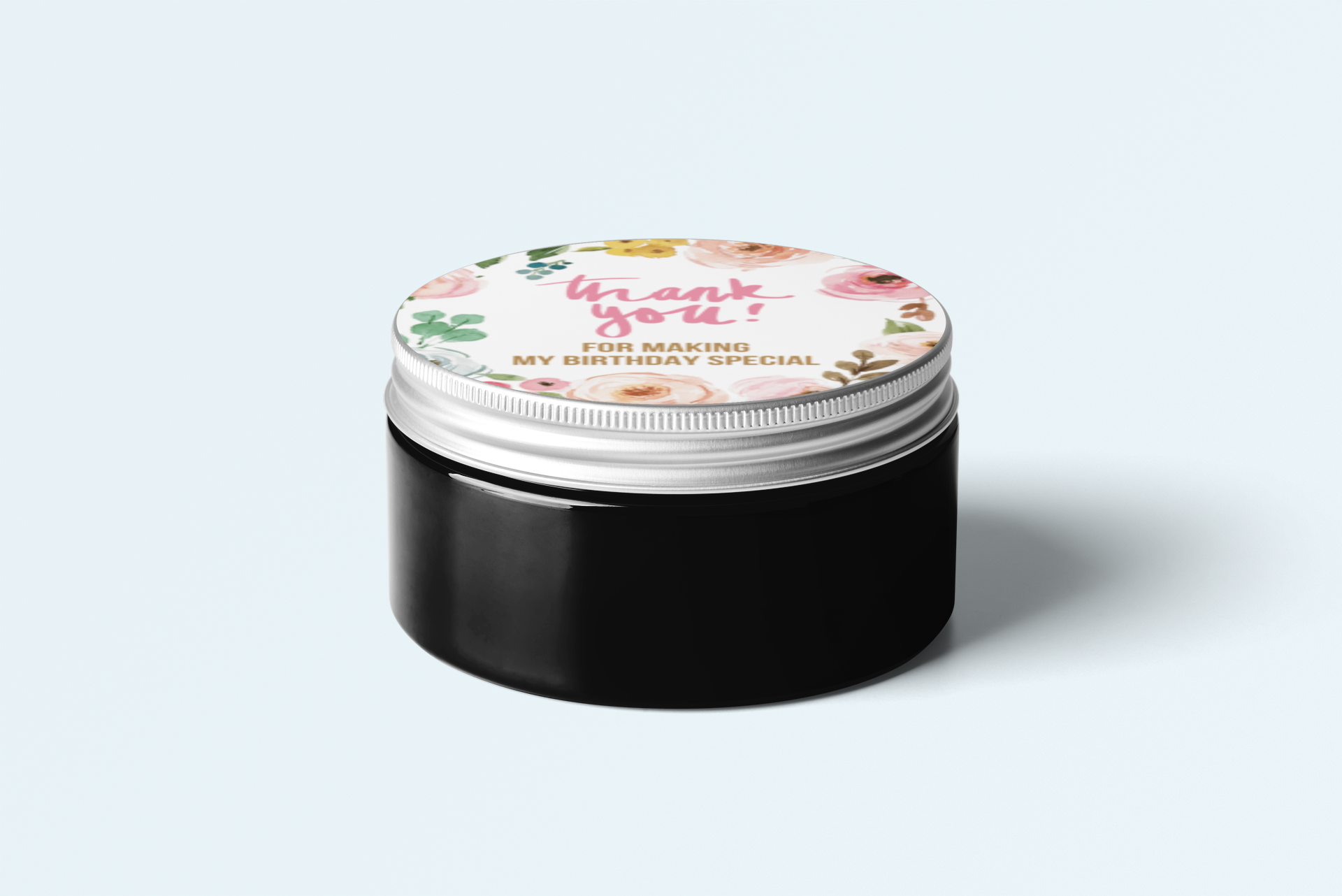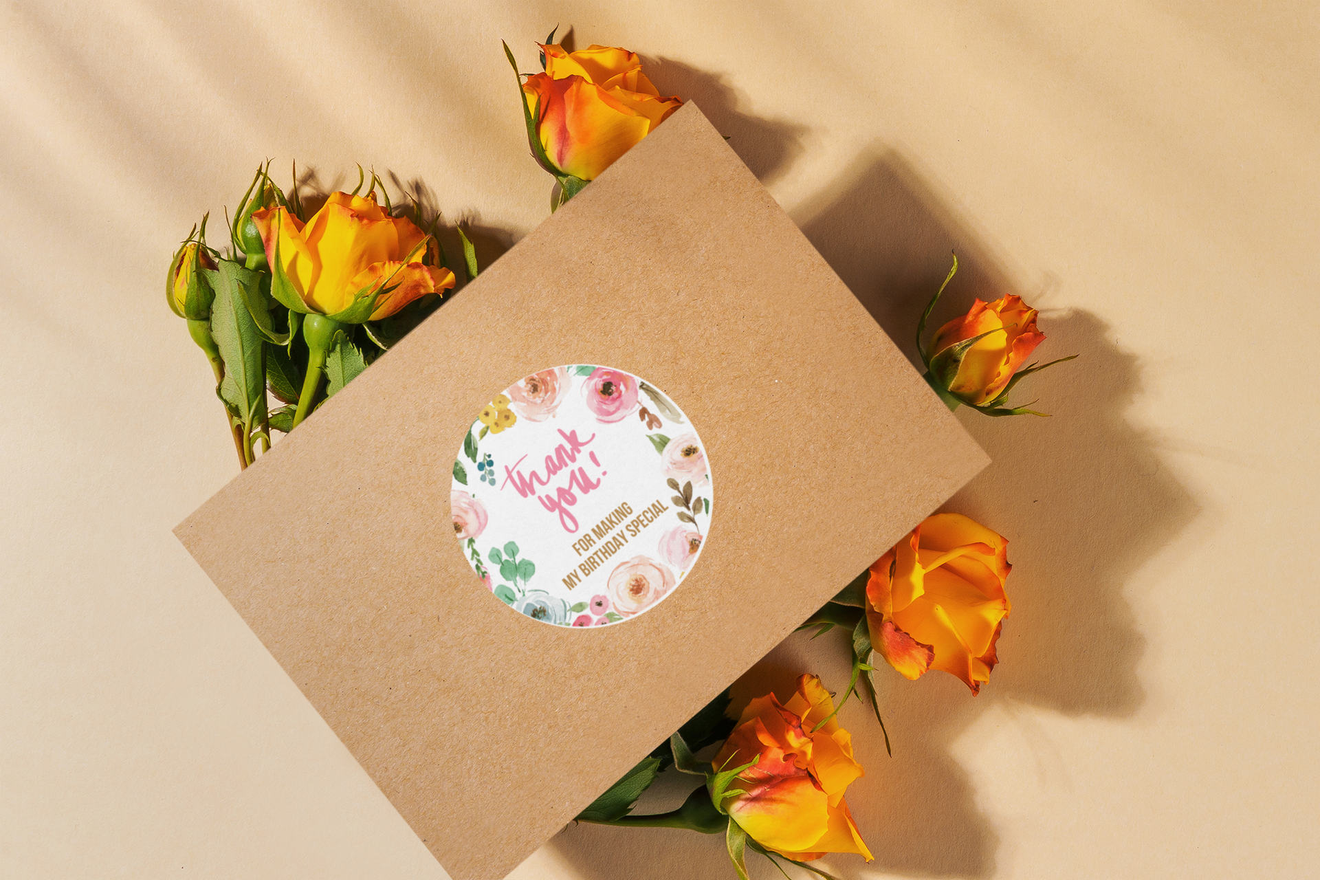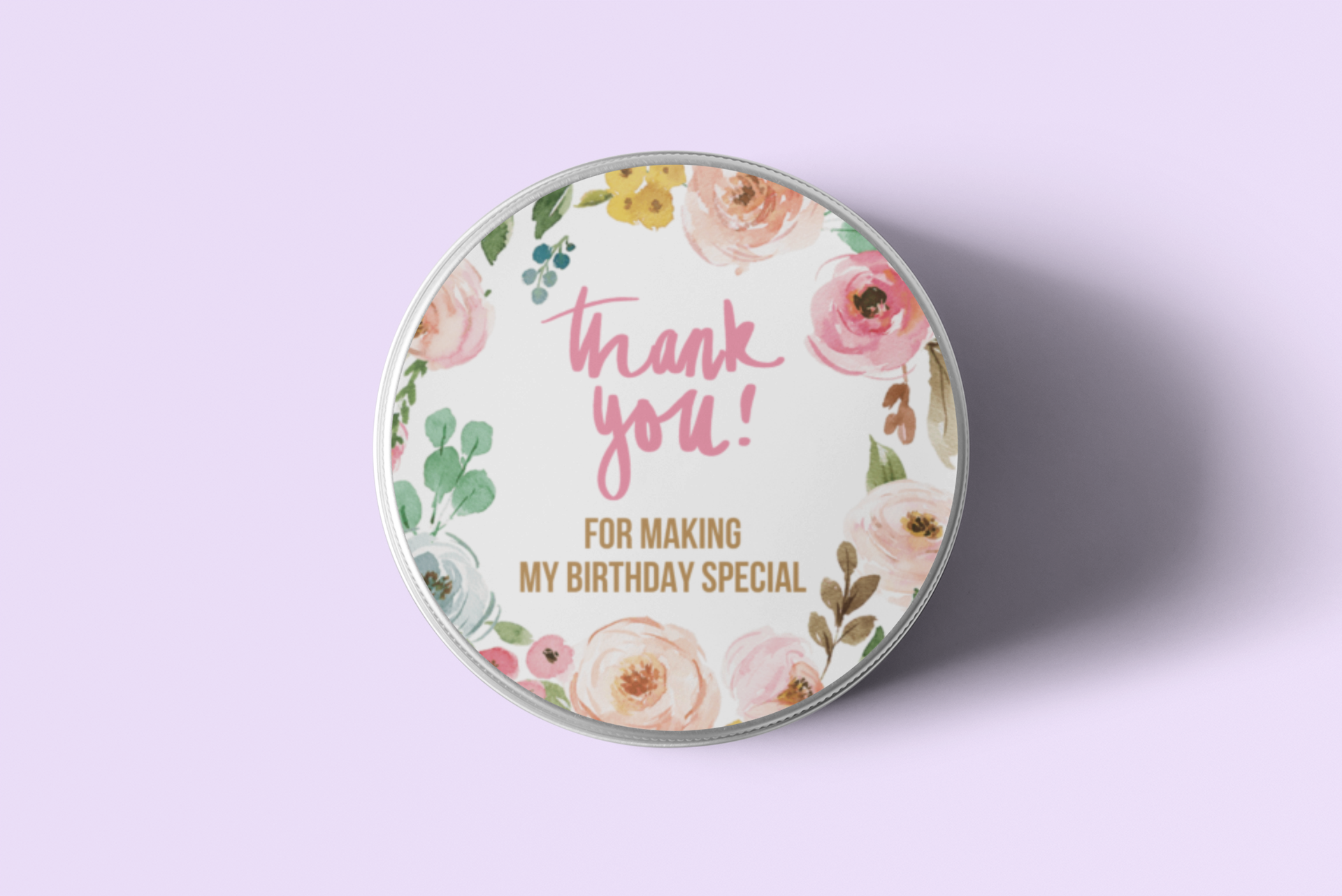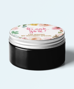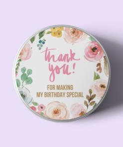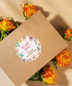 Design: Return gift stickers come in a circular shaped Floral design. The designs comes with Floral and simple text such as “Thank you” or “Happy Birthday” written on it.