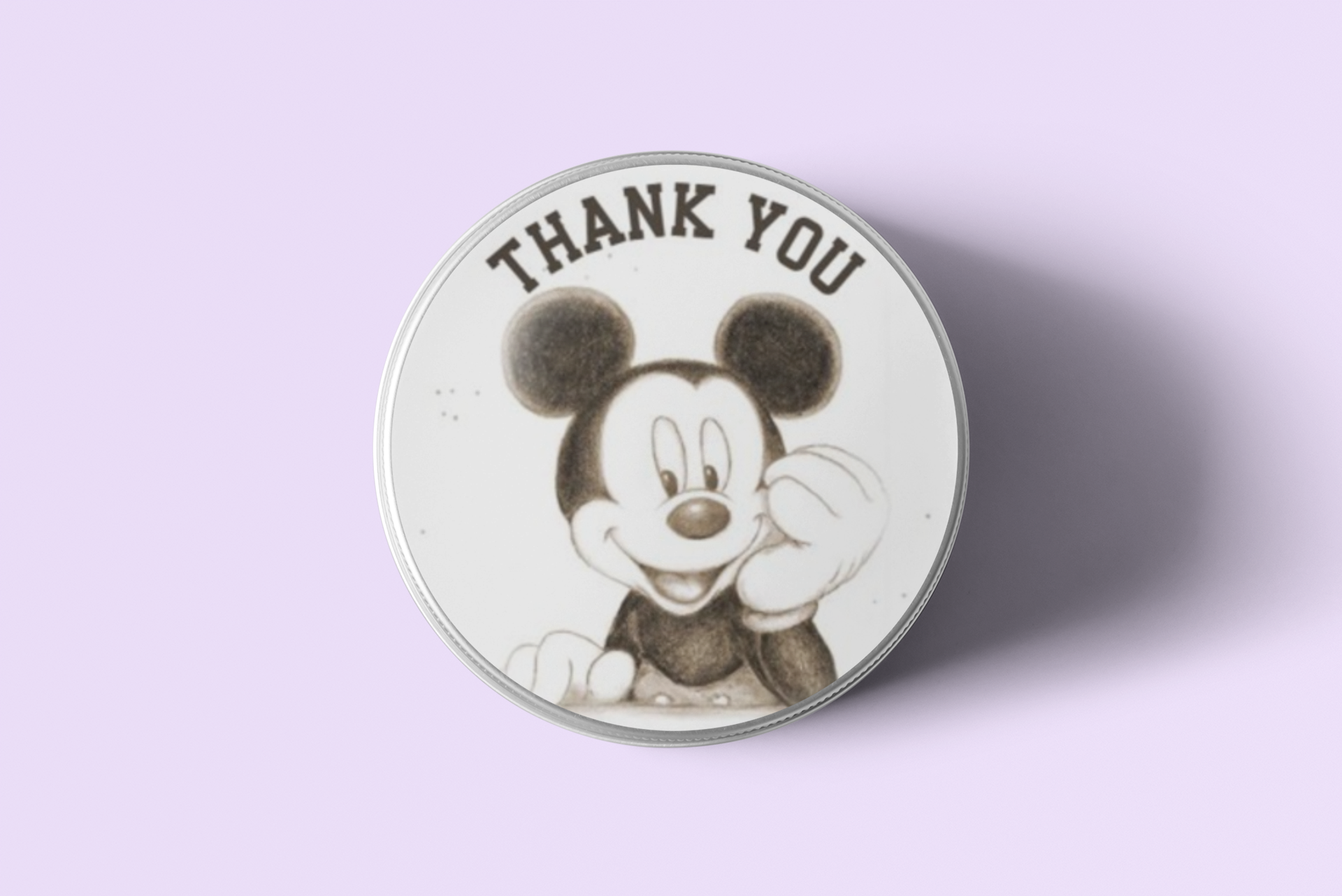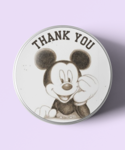 Design: Return gift stickers come in a circular shaped Mickey Mouse design. The designs comes with Mickey Mouse and simple text such as “Thank you” or “Happy Birthday” written on it.