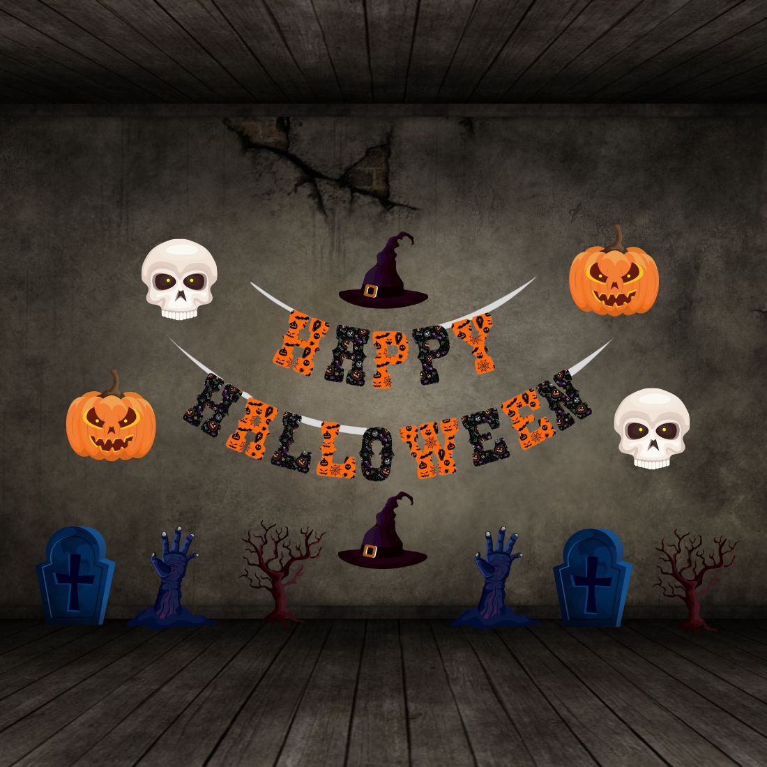 Halloween Banner and Cutout – ( 26 Pcs) Material-Cardstock (6 inches/250 GSM Cardstock/Orange, Black, White, Blue, Brown)
