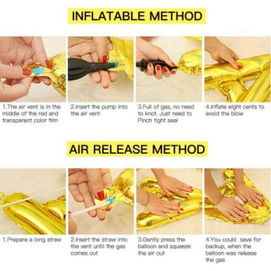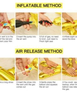 Foil Balloons are very easy to inflate using a straw provided with the kit or any drinking straw. It supports both normal air and helium which can be filled be going to the nearest helium filling store if you want to use floating balloons for your decors. Foil Balloons are self-sealing; it will be sealed automatically once to finished filling the air. Please note that you should only fill 80-85% of the total capacity for long life of foil balloons as it may get blast if over filled.