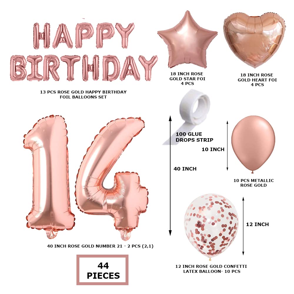 Rosegold Birthday Decor Metallic Balloon, Confetti, Star Foil Balloon, Heart Foil Balloon, Foil Happy Birthday & foil Number (14)