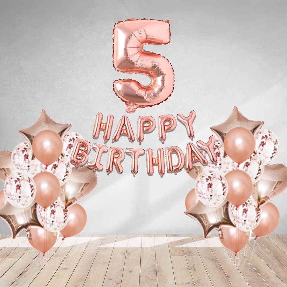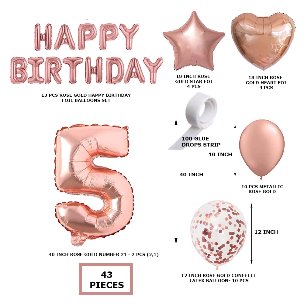 Rosegold Birthday Decor Metallic Balloon, Confetti, Star Foil Balloon, Heart Foil Balloon, Foil Happy Birthday & foil Number (5)