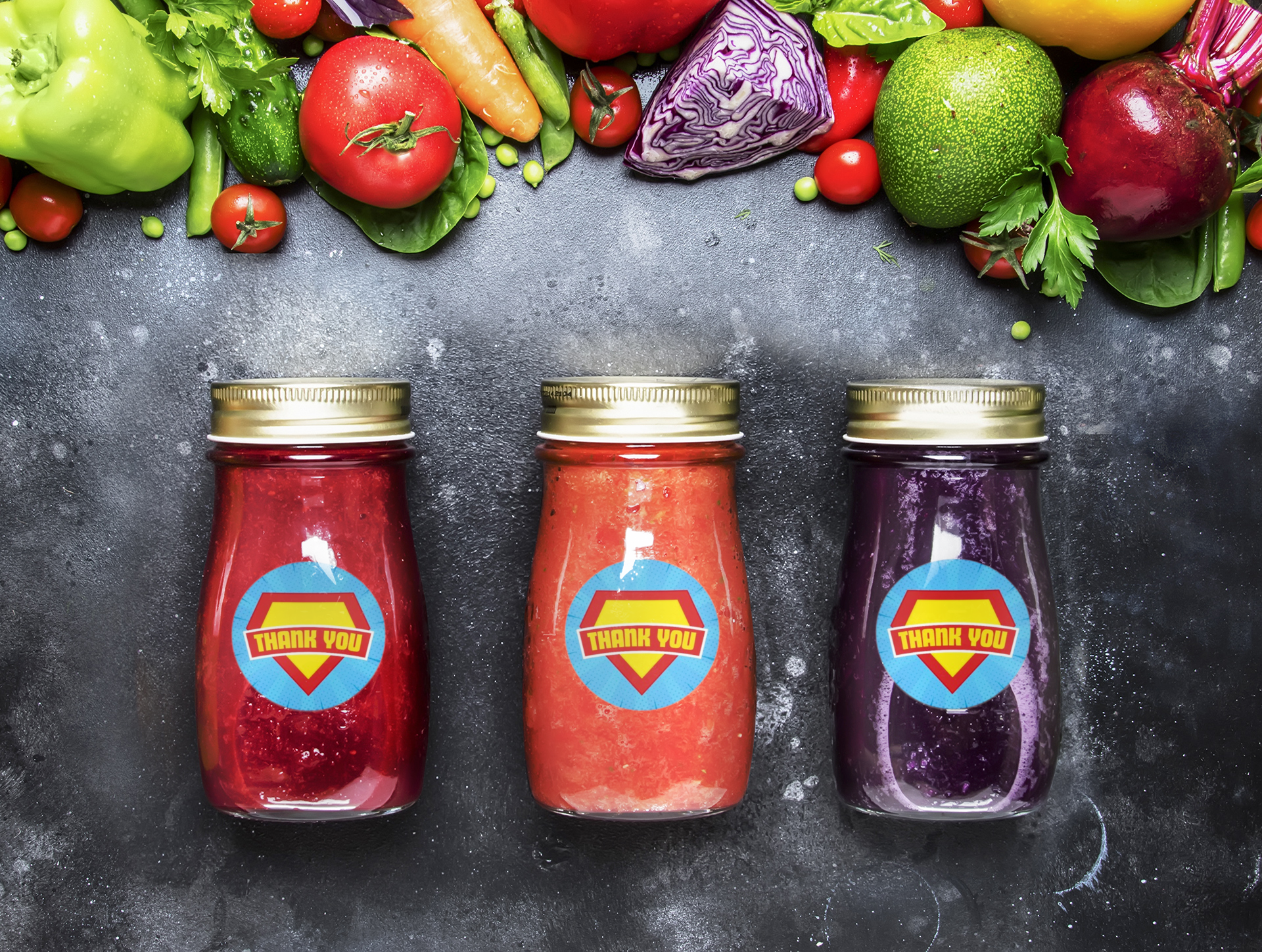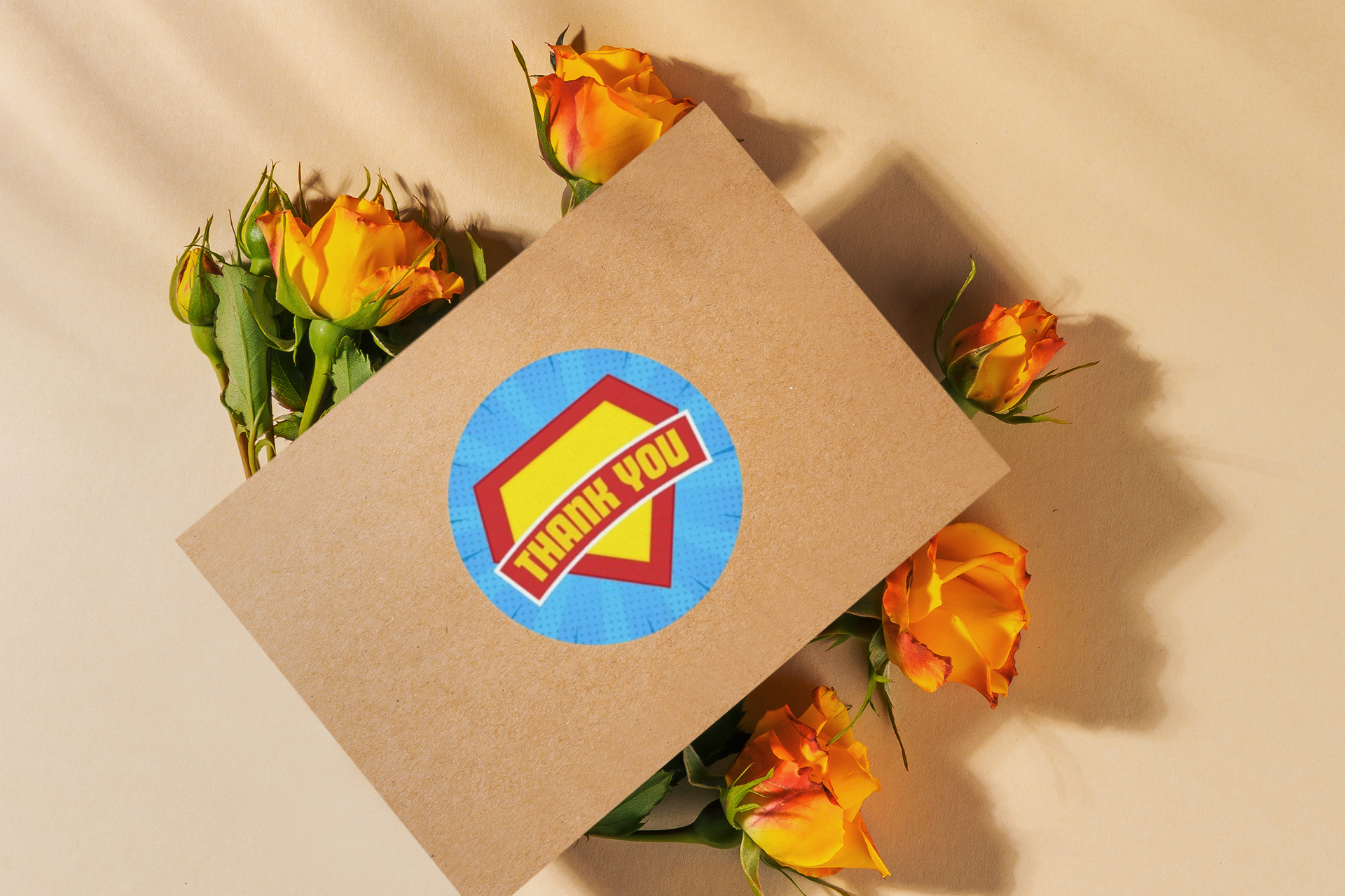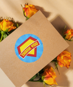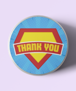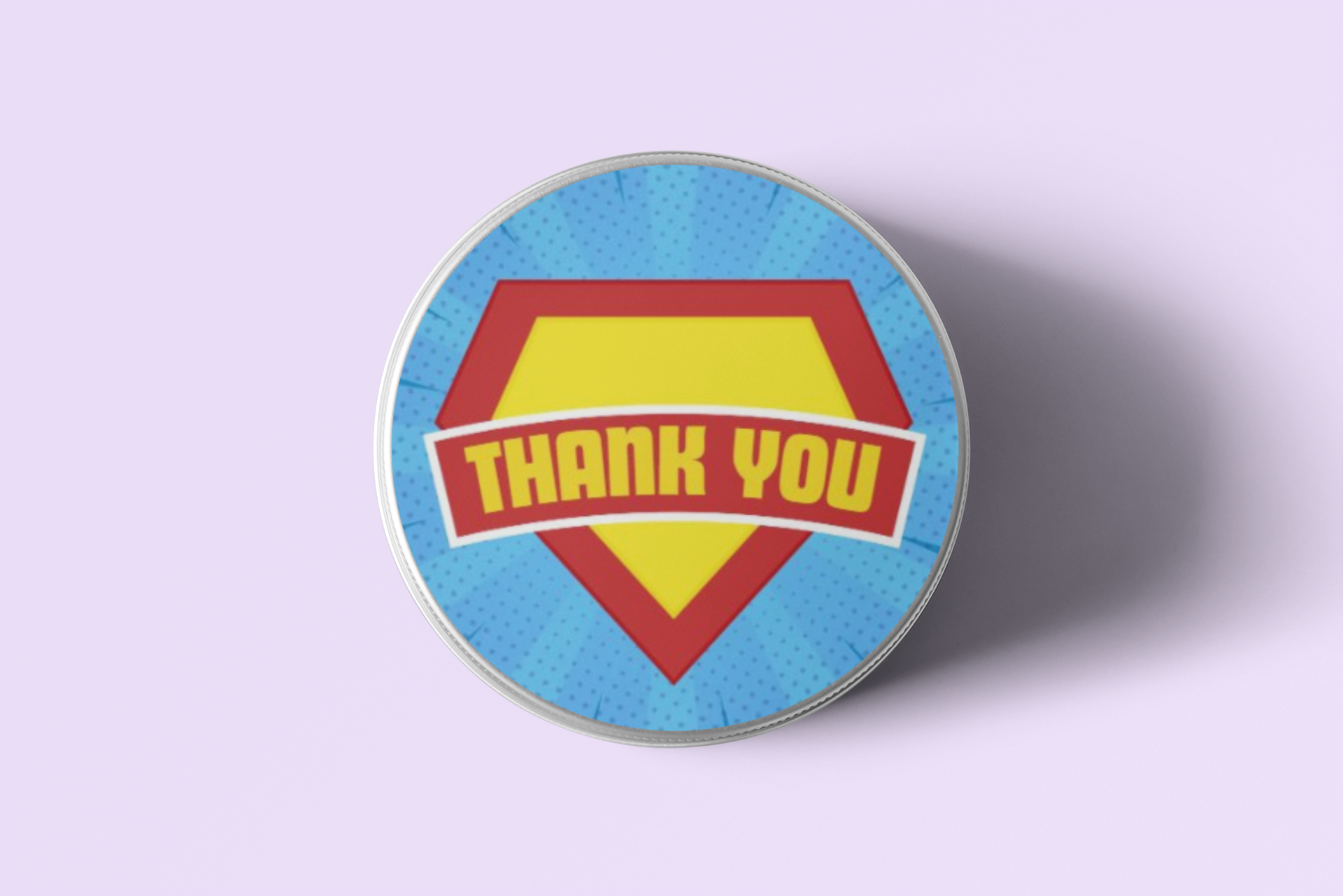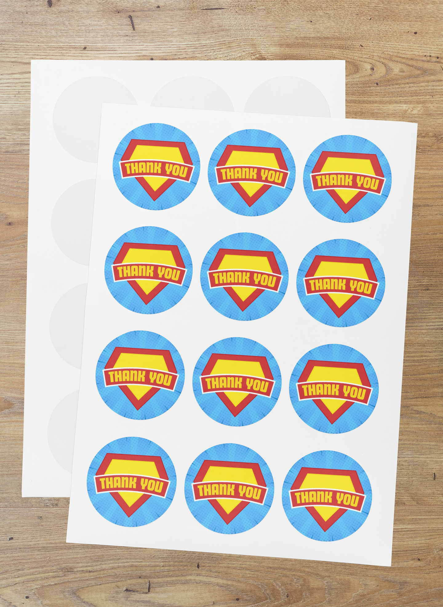 Design: Return gift stickers come in a circular shaped Superhero design. The designs comes with Superhero and simple text such as “Thank you” or “Happy Birthday” written on it.